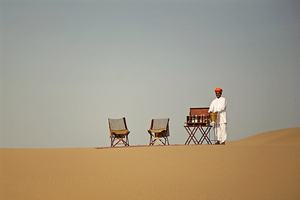 Here, one feels ultimately remote and serenely distant from the hustle and bustle of the city. A stay here is an experience in itself and allows culture seekers an eye-opening visit, with the camp’s historian, to the nearby ‘golden city’ of Jaisalmer with its majestic ‘living’ fort and incredible architecture; a rare glimpse into desert life, visiting local villages and tribes; and be sure to take a leisurely camel ride and peaceful sundowner in iconic dunes with camel herders wandering past.